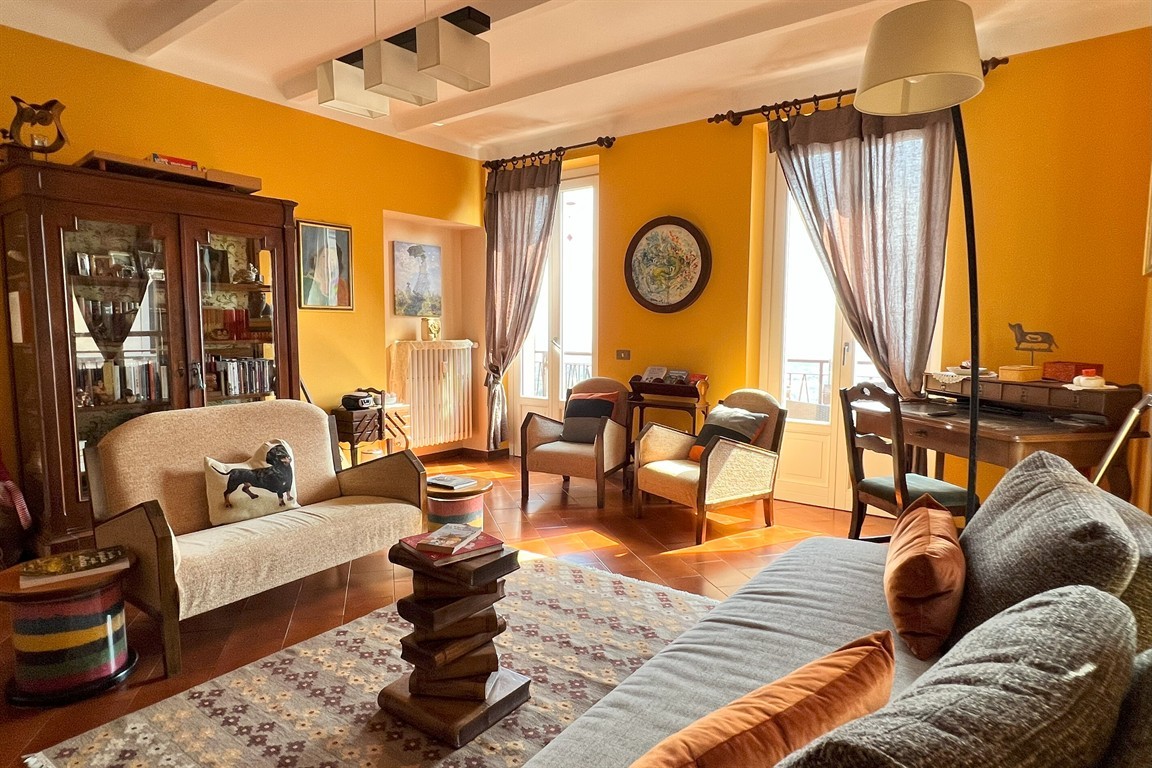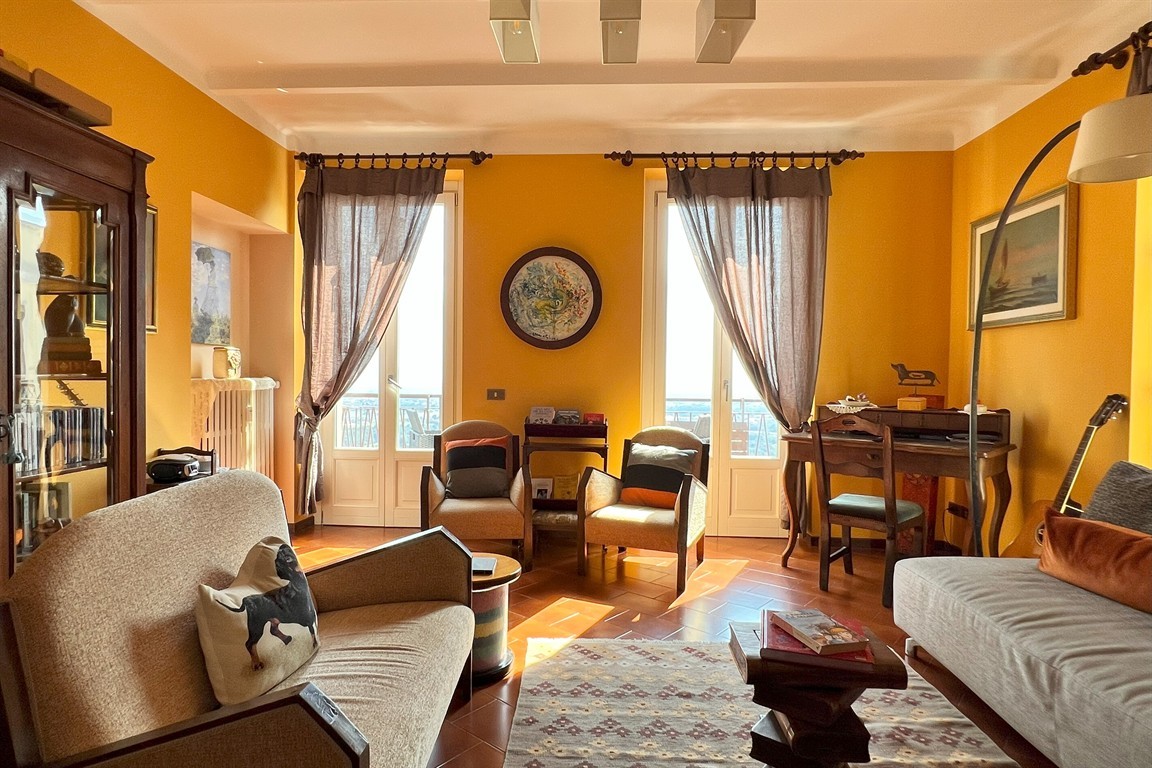 All’appartamento si accede direttamente dall’accogliente soggiorno corredato di romantico caminetto perfettamente funzionante e di tre portefinestre con uscita sul balcone panoramico.