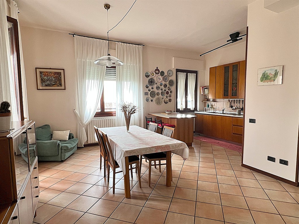 L'ingresso doppio con disimpegno finestrato conduce alla zona giorno composta da una grande cucina attrezzata con penisola e tavolo da pranzo, affaccio su balcone, salotto con zona camino, seconda area pranzo e libreria. Il soggiorno è caratterizzato da numerose finestre che garantiscono una buona illuminazione naturale.