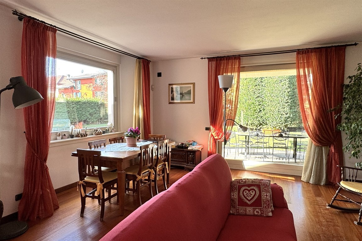 Il giardino pianeggiante con le sue aiuole e pregiati alberi ad alto fusto circonda la casa su tutti i lati.