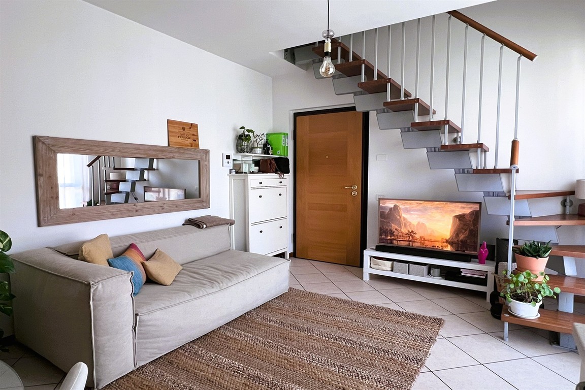 La tipologia dell'appartamento è monolocale composto da ingresso direttamente nel luminoso openspace con antibagno attrezzabile, bagno con doccia ed un balcone dotato di tenda da sole che serve da sfogo nella bella stagione. Una scala interna collega lo spazio giorno ad ulteriore locale posto nel sottotetto (h min. mt 1,00 / h max. mt 2,30)adattabile a seconda delle esigenze ed un secondo vano adibito a bagno di servizio. Entrambi gli ambienti sono riscaldati e dotati di lucernari.